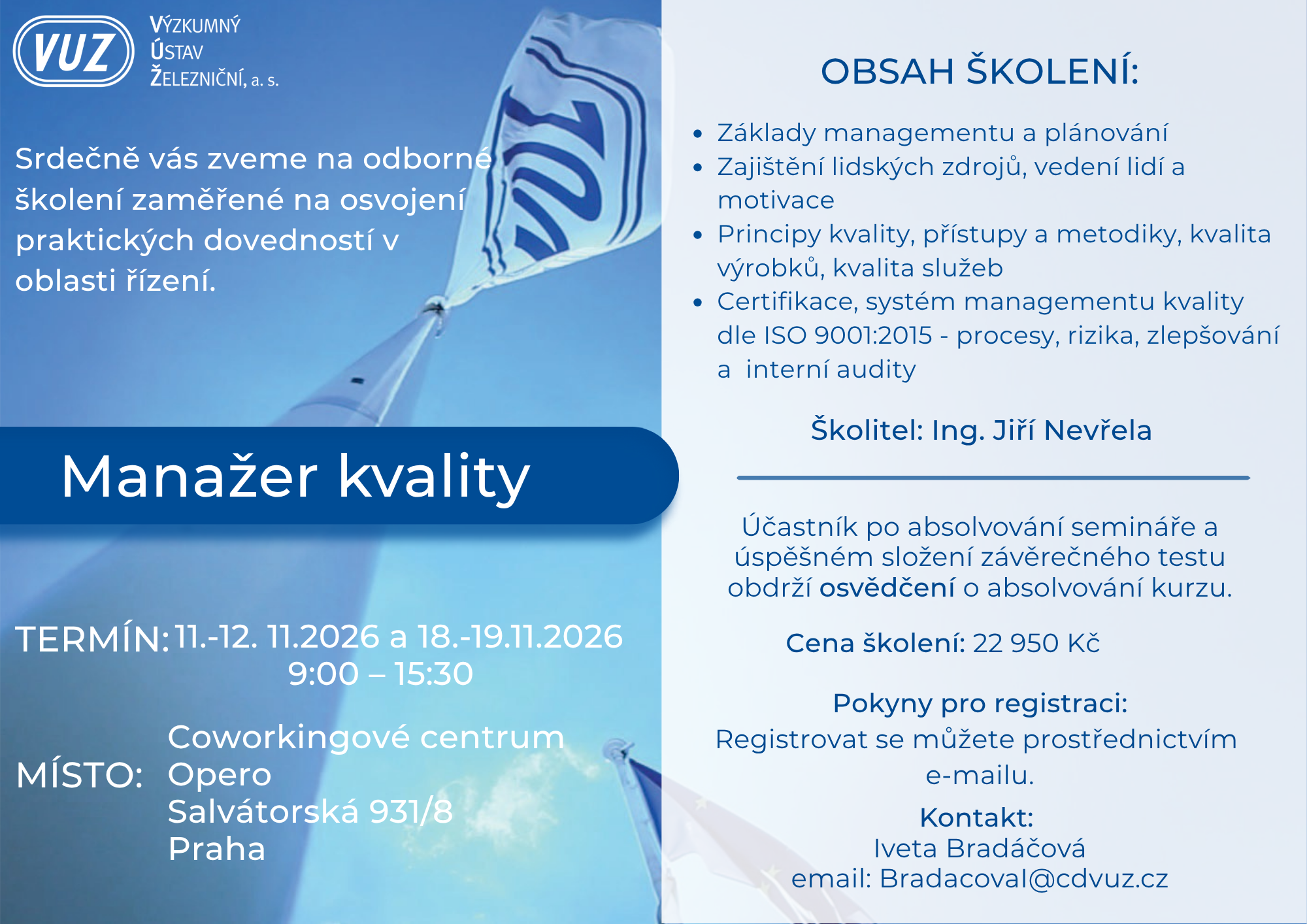 Školení je vhodné pro pracovníky kvality, ty, kteří se na tuto roli připravují, i pro všechny, kdo se chtějí v oblasti řízení kvality dál rozvíjet.