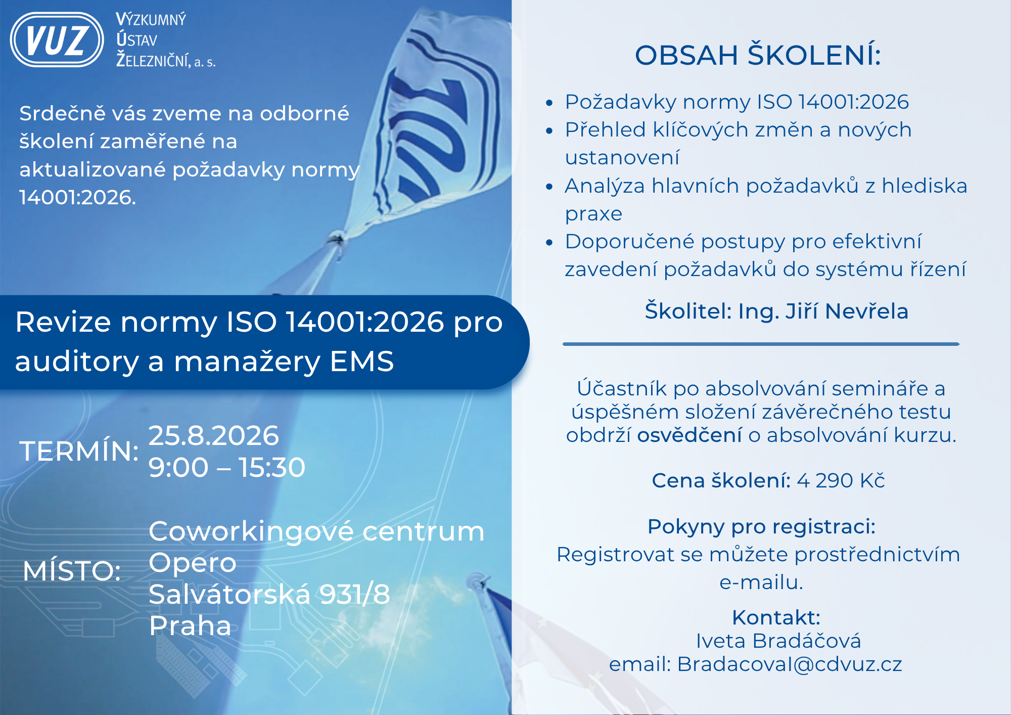 Školení je vhodné pro všechny, kdo mají na starosti oblast životního prostředí, pro auditory, ale i pro ty, kteří se s normou potkávají jen okrajově a chtějí si v ní udělat jasno.